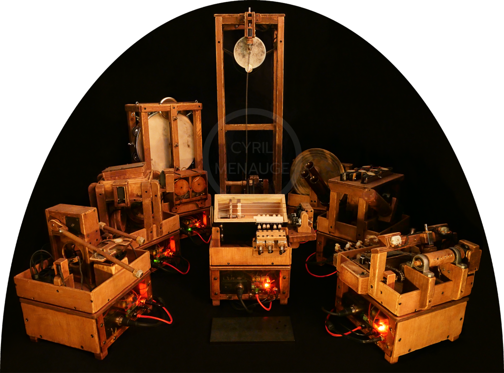 These machines with tangible, organic and random mechanisms follow a score written electronically for them, like a hybrid music box with heterogeneous growths. The motors trigger a wide range of sounds that interact acoustically with the sound projections of the speakers that encompass, accompany and amplify them. This Electromechaphonium embodies an attempt to “re-materialize” written music, but also a desire to question both the dialogue between sound objects and sound bodies dear to Pierre Schaëffer, the musical and poetic sensitivity that can emerge from automated and mechanical music, and the place of randomness in electroacoustic composition.
